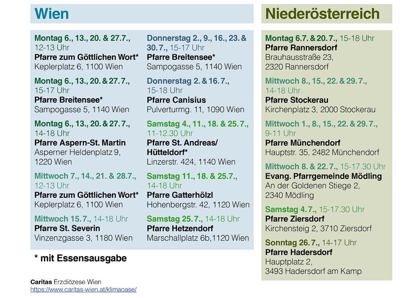 Insgesamt 16 Pfarren der Erzdiözese Wien beteiligen sich in Wien und Niederösterreich bereits am Projekt „Klimaoase“. Information rund um Standorte und Öffnungszeiten finden Sie auf: caritas-wien.at/klimaoase
