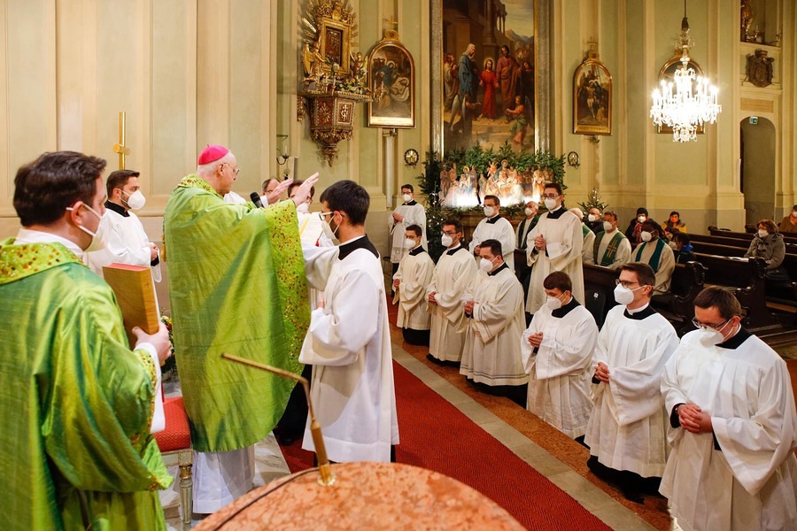 13 Priesteramtskandidaten aus den unter einem Dach organisierten Priesterseminaren der Diözesen Wien, Eisenstadt und St. Pölten, erhielten am Samstag, 22. Jänner 2022 in der Pfarrkirche Lichtental (Wien-Alsergrund) durch Bischof Ägidius Zsifkovics die kirchliche Beauftragung zu Lektoren und Akolythen. Aufgabe eines Lektors ist es, im Rahmen des Gottesdienstes die Lesungen feierlich vorzutragen während der Akolyth bei der Eucharistiefeier am Altar und als außerordentlicher Kommunionspender dient aber auch die Eucharistie zu Kranken bringt.