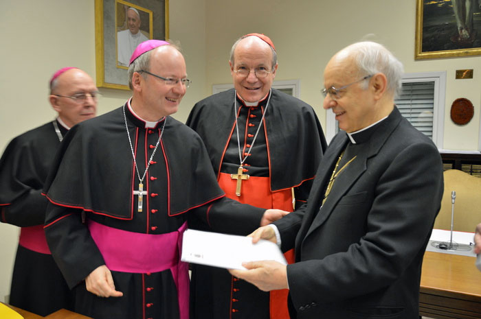 Die österreichischen Diözesanbischöfe haben im Rahmen ihres Ad-limina-Besuchs die Österreich-Ergebnisse der Umfrage über Ehe und Familie an die zuständige vatikanische Stelle übergeben. Die Übergabe erfolgte am Donnerstag, 30. Jänner 2014, unmittelbar vor der gemeinsamen Audienz der Bischöfe bei Papst Franziskus - an den Generalsekretär der Bischofssynode, Lorenzo Baldisseri. Der italienische Kurienerzbischof leitet das Sekretariat, das mit der Vorbereitung der bevorstehenden Bischofssynoden über "Familie und Evangelisierung" beauftragt ist. Die ausgefüllten Fragebögen wurden in Papierform sowie auf elektronischen Datenträgern übergeben.