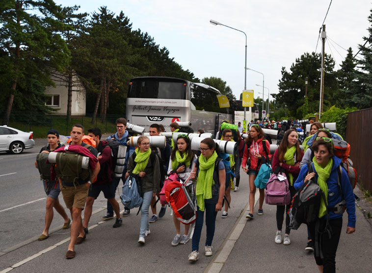 Nach einer über 18-stündigen Busfahrt sind die 1.500 jungen Männer und Frauen aus der Diözese Versailles in den Morgenstunden am Dienstag, 19. Juli 2016 in Wien eingetroffen. Auf ihren Kapuzen-Pullover ist in geschwungener Schrift: "Génération miséricorde" zu lesen: Die "Generation Barmherzigkeit" ist auf dem Weg zum Weltjugendtag in Krakau, zwei Tage machen sie Station in Wien. Bepackt mit Rucksäcken, Isomatten und Schlafsäcken begeben sie sich zum Frühstück, das ab 7 Uhr im Sportcenter Donaucity auf sie wartet.