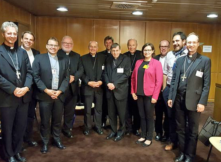 Die deutsche Sprachgruppe bei der Bischofssynode Jugend 2018 (v.l.n.r.): Weihbischof de Raemy, Bischof Oster SDB, Bischof Holub, Kardinal Marx, Bischof Genn, P. Blattert SJ, Kardinal Koch, Kardinal Schönborn, Julia Braband, Weihbischof Wübbe, Thomas Andonie, Weihbischof Turnovszky.