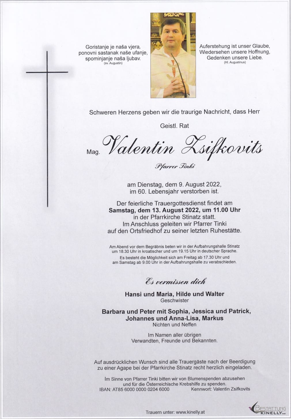 Am 13. August 2022 findet um 11.00 Uhr in der Pfarrkirche Stinatz/Stinjaki im Burgenland der Trauergottesdienst für Valentin Zsifkovics mit anschließender Beisetzung am Ortsfriedhof statt. (Download der Parte)