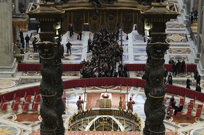 Der Leichnam des am Silvestertag verstorbenen ehemaligen Papstes ist seit Montagfrüh im Petersdom aufgebahrt. Allein am Montag kamen nach Polizeiangaben rund 65.000 Menschen in die vatikanische Basilika, um Benedikt XVI. die letzte Ehre zu erweisen. Noch bis Mittwochabend ist ein persönlicher Abschied vom ehemaligen Papst möglich.