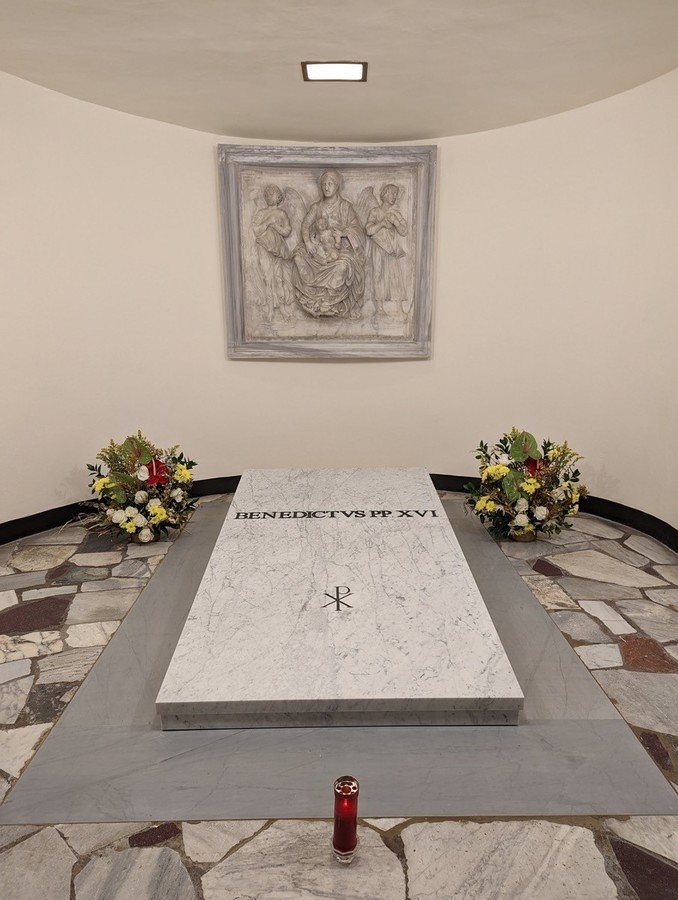Am vergangenen Donnerstag war Benedikt XVI. dort in einem kleinen Kreis beigesetzt worden.Der schlichte weiße Marmorstein mit der Aufschrift "Benedictus PP XVI" befindet sich gegenüber des Altars der Krypta. Auf der gegenüberliegenden Seite steht der Sarkophag von Papst Pius XI.