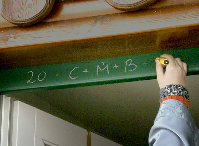 Einer der drei Könige schreibt den Segensspruch C+M+B ( stehen für "Christus mansionem benedicat" - "Christus segne dieses Haus) an den Türstock.