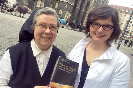 Herausgeberin Sr. Beatrix Mayrhofer und Autorin Monika Slouk präsentieren das Buch „Ein bisserl fromm waren wir auch“.