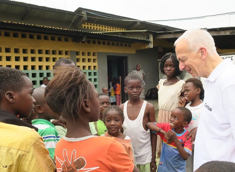 Caritaspräsident Michael Landau mit kongolesischen Kindern im Austausch.