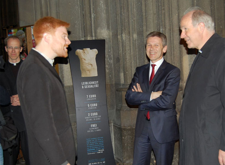 Hoher Besuch in der erfolgreichen Ausstellung "Leiblichkeit und Sexualität" in der Wiener Votivkirche: Kardinal Christoph Schönborn und der für Kultur zuständige Kanzleramtsminister Josef Ostermayer ließen sich am Donnerstag, 15. Mai 2014, von Kurator David Rastas und dessen theologischem Berater P. George Elsbett durch die erfolgreiche, bisher von rund 10.000 Interessierten besuchten Schau führen und Werke international renommierter Künstlern - darunter Damien Hirst, Doug Aitken, Joseph Beuys, Takashi Murakami und als heimische Größe Erwin Wurm - erläutern. Beide haben auch die Schirmherrschaft und den Ehrenschutz für die Ausstellung übernommen.
