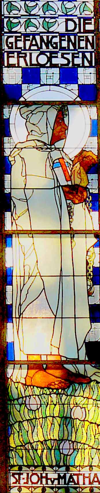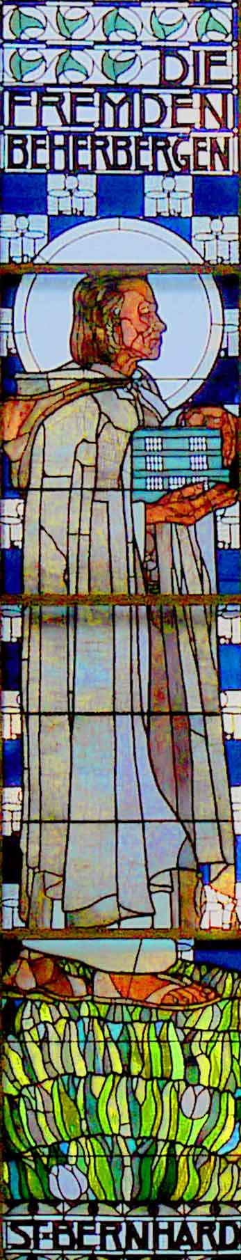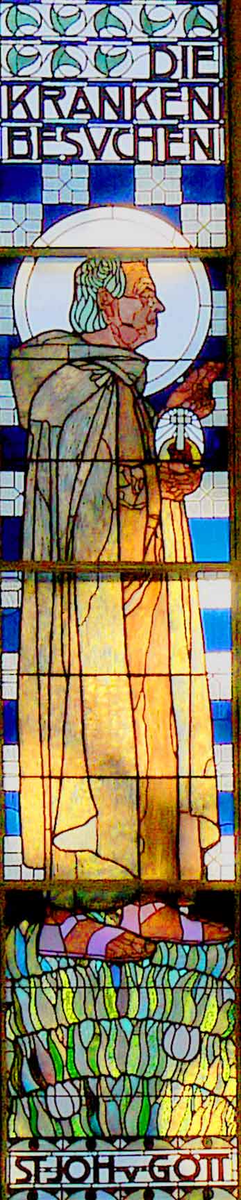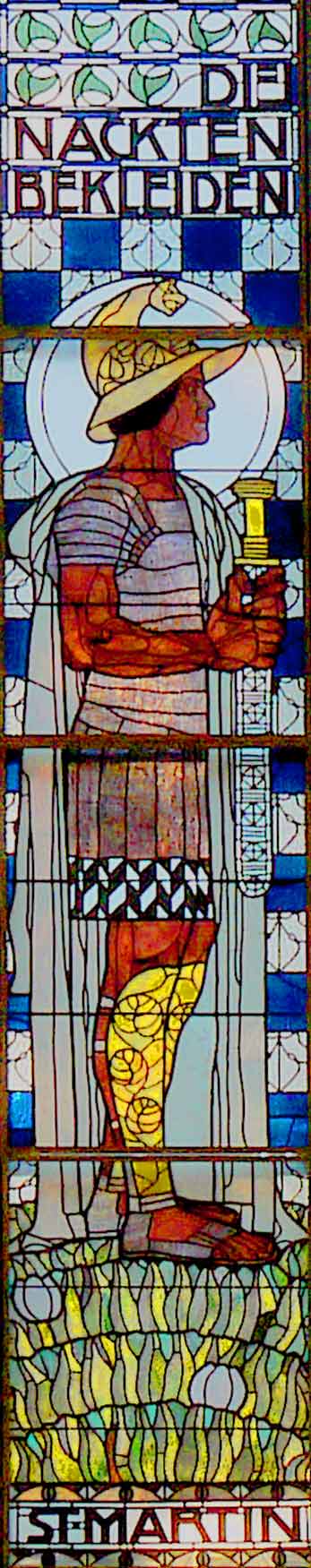 Die Glasmosaikfenster im Tiffany-Stil wurden von Koloman Moser geschaffen. Das westliche Fenster mit dem Sinnspruch „Wahrlich sage ich euch. Was ihr einem dieser meinen geringsten Brüder getan habt das habt ihr mir getan“ zeigt dabei die leiblichen Tugenden.
