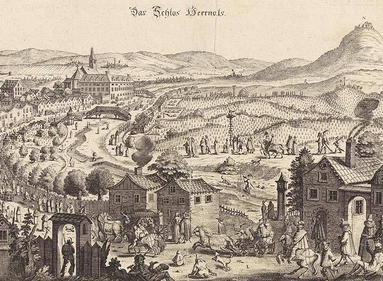 Ansicht von Hernals, „Auslaufen“ der Wiener Protestanten zum Gottesdienst in die evangelische Hochburg.