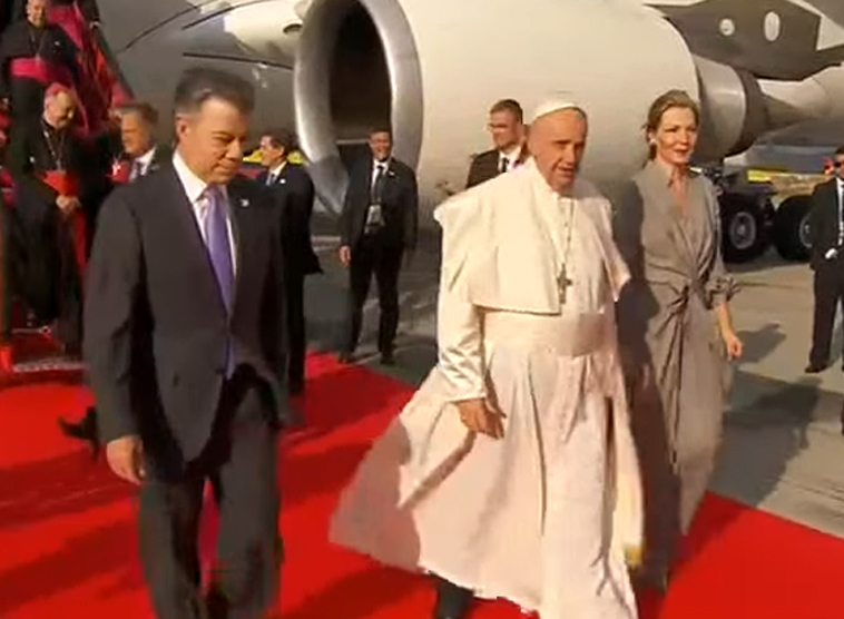 Papst Franziskus wurde von Präsident Santos am Flughafen begrüßt.