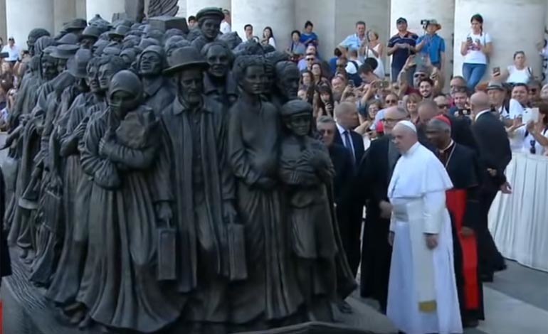 Papst Franziskus hat am Ende eines Gottesdienstes zum Welttag des Migranten am Sonntag, 29. September 2019 auf dem Petersplatz die Plastik eines Migrantenschiffes enthüllt. Das aus Bronze und Ton gestaltete Werk des kanadischen Künstlers Timothy Schmalz zeigt ein Schiff, an dessen Bord 140 Migranten verschiedener Herkunftsländer und Zeiten zu sehen sind. Die Plastik trägt den Titel "Angels unaware" ("Ungeahnte Engel").