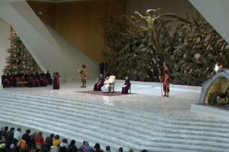 Letzte Generalaudienz vor Weihnachten. Täglichen Bildern von Gewalt und Waffen stellt Krippe "kunstvoll gestaltetes Bild des Friedens" entgegen.