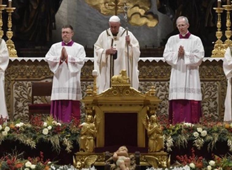 Zum Beginn der Feier erklang die traditionelle gesungene Ankündigung der Geburt Jesu, die sogenannte Kalenda. Der lateinische Gesang stellt das Geschehen in Bethlehem in eine Abfolge biblischer und weltgeschichtlicher Ereignisse seit der Erschaffung der Welt. Anschließend stimmten die Glocken des Petersdoms Festgeläut an.