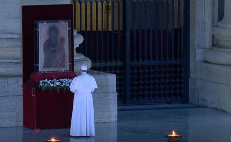 In dieser dramatischen Situation voll von Leiden und Ängsten, welche die ganze Welt bedrücken, wenden wir uns an dich, o Mutter Gottes und unsere Mutter, und suchen Zuflucht unter deinem Schutz und Schirm.