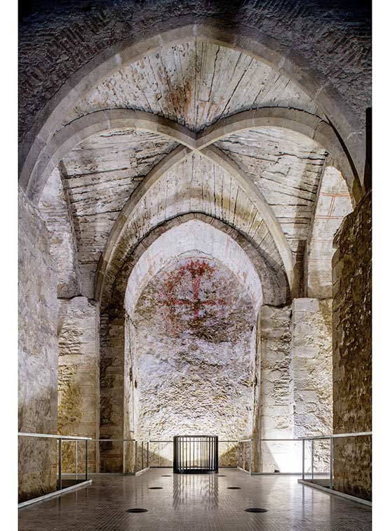 Die Besucher steigen über eine schwarze Wendeltreppe in den hohen Kapellenraum hinab und gelangen auf eine Fläche, von der aus man das mittelalterliche Mauerwerk umfassend in den Blick nehmen kann.