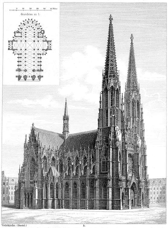 Die nach einem Entwurf von Heinrich von Ferstel – der auch die benachbarte Universität plante – erbaute Votivkirche wurde am 24. April 1879, dem 25. Hochzeitstag von Kaiser Franz Joseph und Elisabeth, feierlich geweiht.