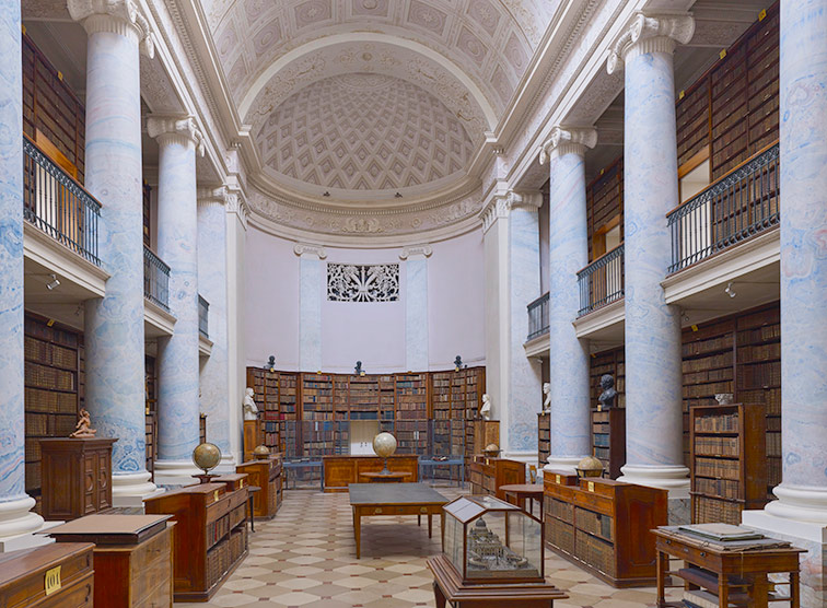 Als ein besonderer Ort im Wiener Schottenstift gilt auch die alte Klosterbibliothek, ein Werk Josef Kornhäusls, des großen Wiener Architekten des Klassizismus. Die Bibliothek mit 130.000 Bänden von vor 1900 bildet genau in der Mittelachse des Klosters. „Man kann das Kloster nach Norden und Süden genau an dieser Achse spiegeln“, erklärt Pater Augustinus. Ein großer, feierlicher, weihevoller Raum, der von außen gänzlich unsichtbar ist.