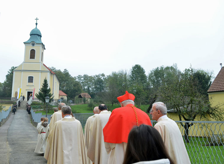 Ich darf hier ein Beispiel dankbar nennen. Ich könnte Dutzende andere anführen. Obergänserndorf liegt im Bezirk Korneuburg. Der kleine Ort, der sich sanft in eine Mulde des Weinviertels schmiegt, zählt ganze 559 Katholiken. Vor wenigen Tagen durfte ich dort den 200. Jahrestag der Kirchweihe feiern. Die schlichte Hallenkirche, die über dem Ort thront und ihn gleichsam beschützt, wurde 1813 erbaut und am 16. Oktober 1814 von meinem Vorgänger Erzbischof Hohenwarth geweiht. Nach mehrjähriger Renovierung erstrahlt sie außen und innen in neuem Glanz. Unglaublich, was die Bevölkerung hier an Eigenleistung erbracht hat. Viele Helfer und Spender gehören nicht zu den eifrigen Kirchgängern. Aber die Liebe zu ihrer Dorfkirche bewegt sie zu großem Einsatz. Wirklich, hier lebt "der Eifer für das Haus Gottes"!