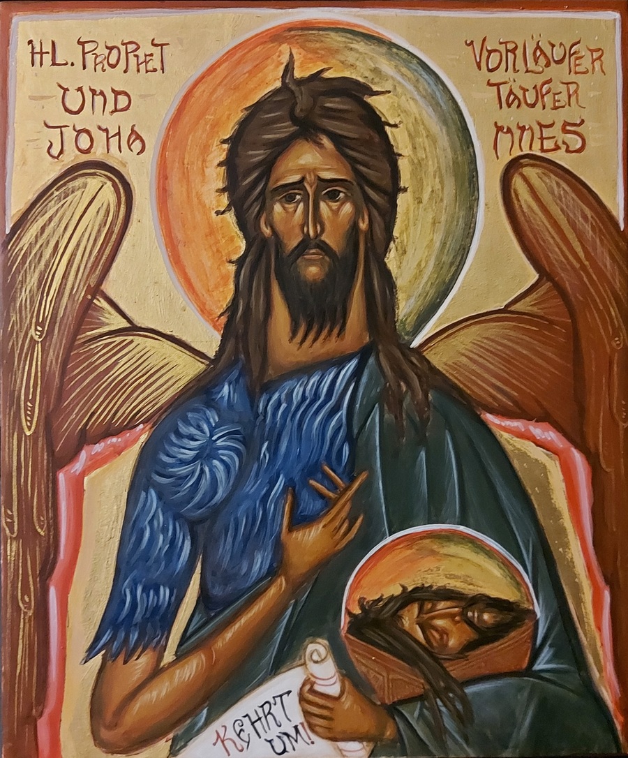 Prophet Gottes und Vorläufer der Gnade, nachdem wir Dein Haupt wie eine hochgeweihte Rose in der Erde gefunden, empfangen wir immerfort Heilung, denn wiederum, wie einstmals, predigst Du der Welt die Umkehr (Kontakion 4. Ton).