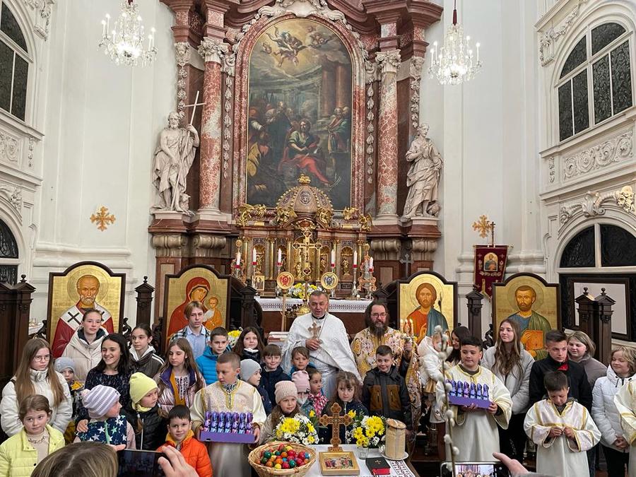 Am Karsamstag, dem Vortag des Festes der Auferstehung Christi, überreichten Kinder der ukrainischen Gemeinde in Salzburg Erzbischof Franz Lackner das ukrainische traditionelle Osterbrot-Paska, eigens von ukrainischen Frauen gebacken, als Zeichen der Dankbarkeit für sein Gebet, seine Fürsorge und sein offenes Herz für das Leid des ukrainischen Volkes! Der Erzbischof versicherte auch weiterhin sein Gebet und seine Unterstützung. Am Ostersonntag erhielten die Kinder der ukrainischen Gemeinde in der St. Markus Kirche süße Ostergeschenke, die im Namen von Erzbischof Lackner verteilt wurden.