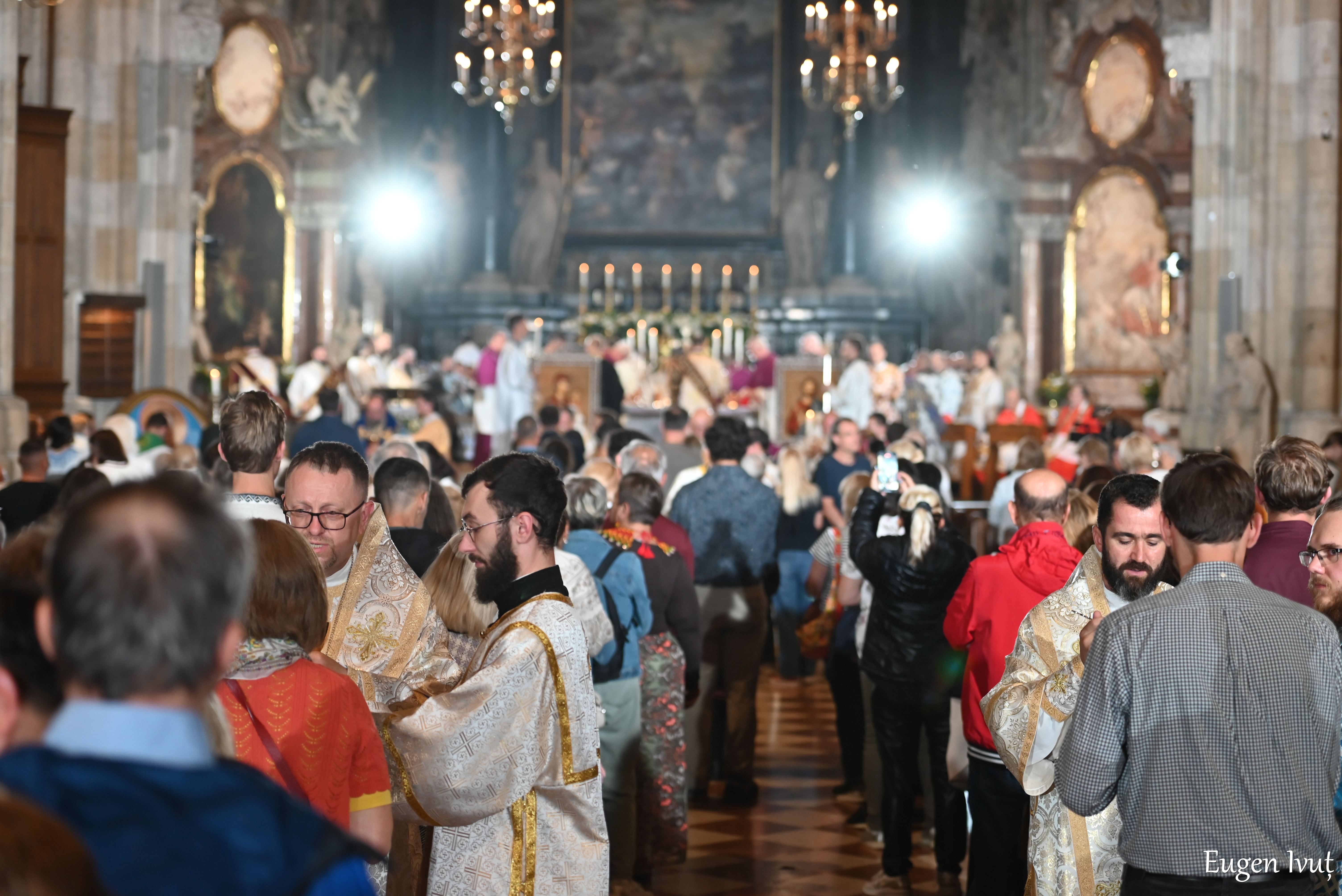 Eine "Göttliche Liturgie" im Wiener Stephansdom mit mehr als 50 Bischöfen war Mittwochabend der liturgische Höhepunkt der Vollversammlung der Bischöfe der katholischen Ostkirchen Europas. Dem Gottesdienst stand Großerzbischof Swjatoslaw Schewtschuk, Oberhaupt der Ukrainisch-katholischen Kirche, vor. Mit ihm konzelebrierten zahlreiche Metropoliten und Bischöfe. Kardinal Christoph Schönborn, Ordinarius für die katholischen Ostkirchen in Österreich, und Kardinal Claudio Gugerotti, Präfekt des Dikasteriums für die orientalischen Kirchen, nahmen ebenfalls teil; dazu von römisch-katholischer Seite u.a. auch der Wiener Weihbischof Franz Scharl, der Apostolische Administrator Josef Grünwidl, Domkustos Rudolf Prokschi oder der Generalsekretär der Bischofskonferenz, Peter Schipka.