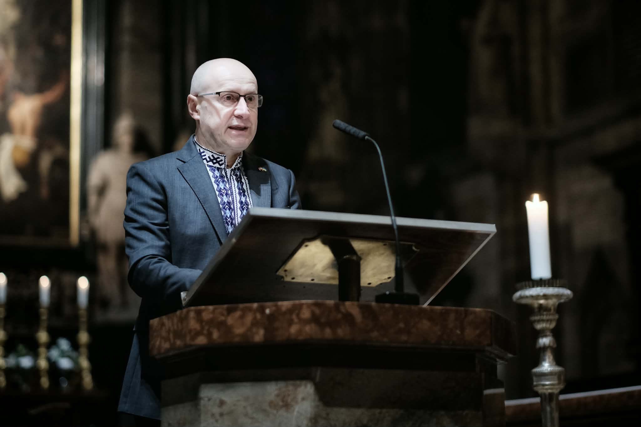 Die traditionelle Kerze des Gedenkens wurde im Dom vom ukrainischen Botschafter zusammen mit Vertretern der österreichischen Staatsgewalt, hochwürdigen Geistlichen der ukrainischen und der österreichischen katholischen Kirche sowie europäischen Botschaftern entzündet.
