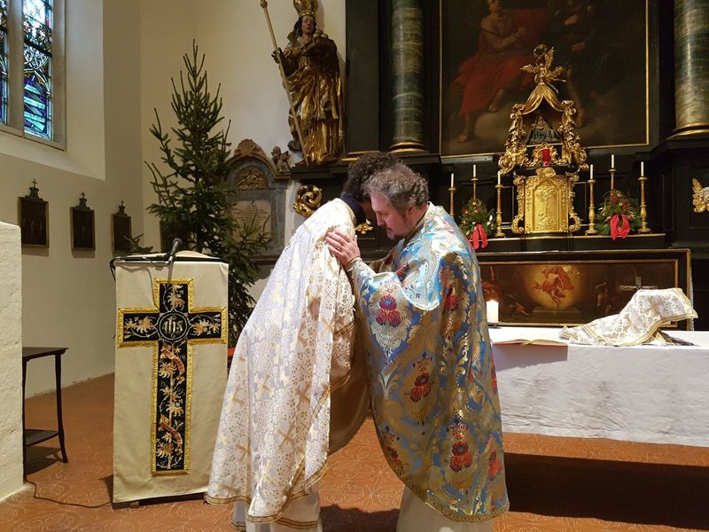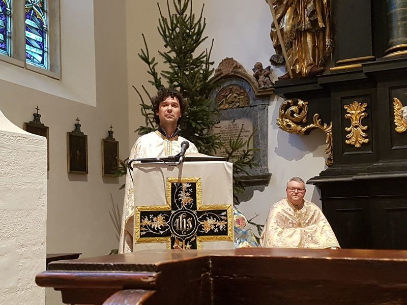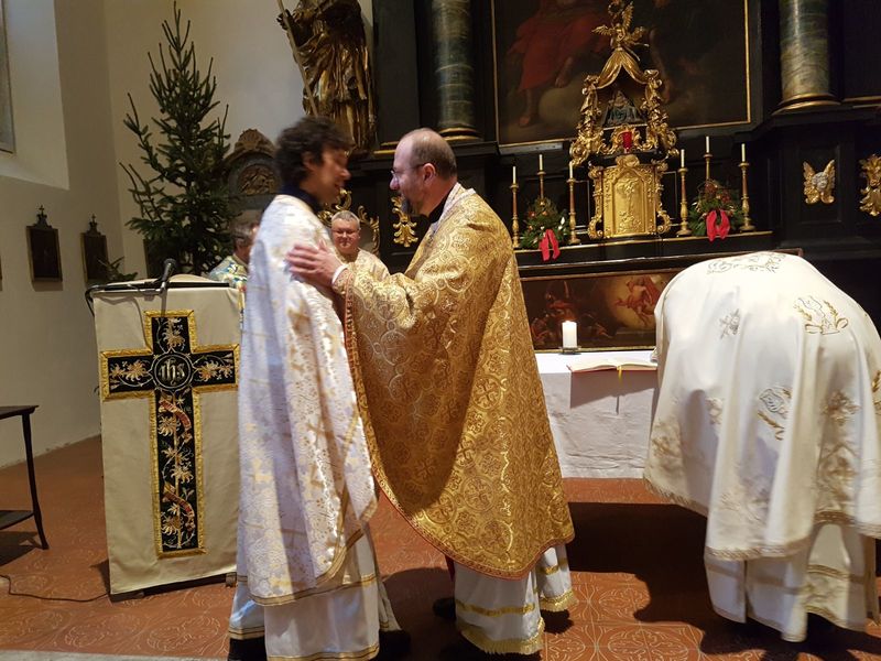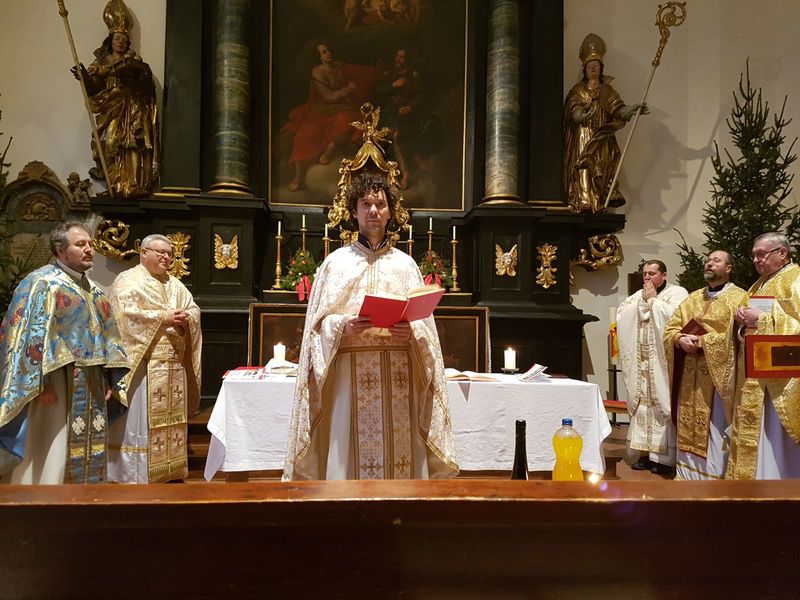 Generalvikar Yuriy Kolasa begrüßte V. Tamas im Namen des Ordinarius, Christoph Kardinal Schönborn, und gab dessen Gebete und Segenswünsche für die neue rum.-unierte Gemeinde weiter.