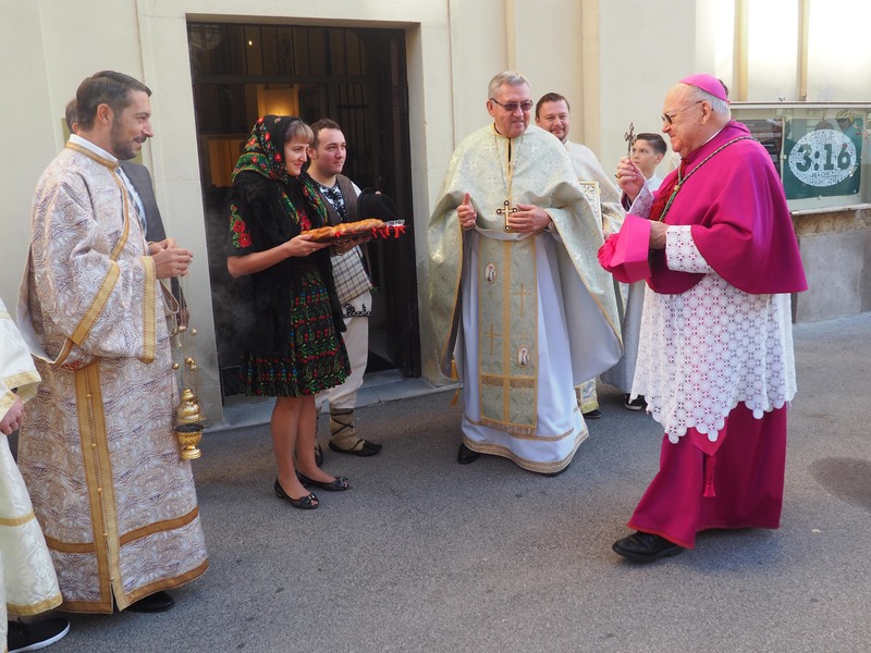 Einen besonderen Gast konnte die rumänisch-unierte Mission in Wien, Penzing am Sonntag, den 15. Oktober 2017 begrüßen: Generalabt Propst Bernhard H. Backovsky von Klosterneuburg. Er feierte gemeinsam mit der ganzen Gemeinde die Göttliche Liturgie. Hauptzelebrant war der Rektor der rum.-unierten Mission, Ekan. Mag. Vasile Lutai. Konzelebriert haben lic. Mag. Joan Julian Hotico, Diakon Mag. Felcian Fladu und Pater Pius. Der Violinist Tudor Andrei spielte am Ende eine wunderschöne Balade.