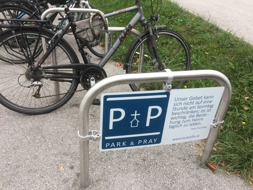 Direkt neben dem Park+Pray Radständer ist die Kirche oder besser gesagt umgekehrt - der Fahrradständer ist am Platzerl zwischen Kirche und Pfarrheim.