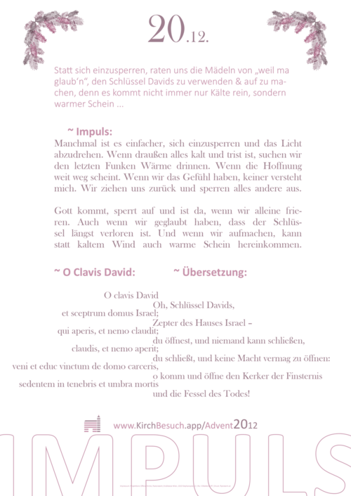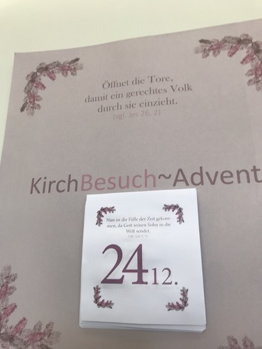 Jeder der 24 Dezembertage bis Weihnachten gibt es einen extra, kurzen Adventimpuls - ein wenig Musik und Texte, die zum Nachdenken, still Werden und Beten anregen. Damit der Kirchraum zum Begegnungsort mit Gott werden kann + das 24 Tage lang.