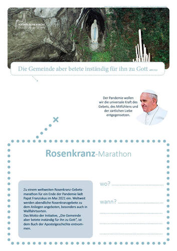 Zu einem weltweiten Rosenkranz-Gebetsmarathon für ein Ende der Pandemie lädt Papst Franziskus im Mai 2021 ein. Überall werden abendliche Rosenkranzgebete zu dem Anliegen angeboten, besonders auch in Wallfahrtsorten.