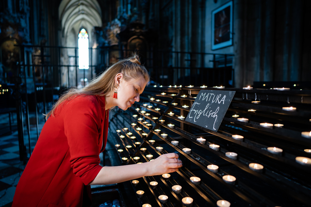Constanze Huber zündet eine Kerze für Maturanten im Stephansdom an.