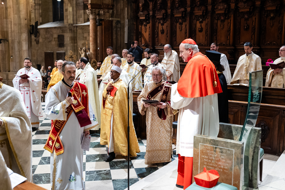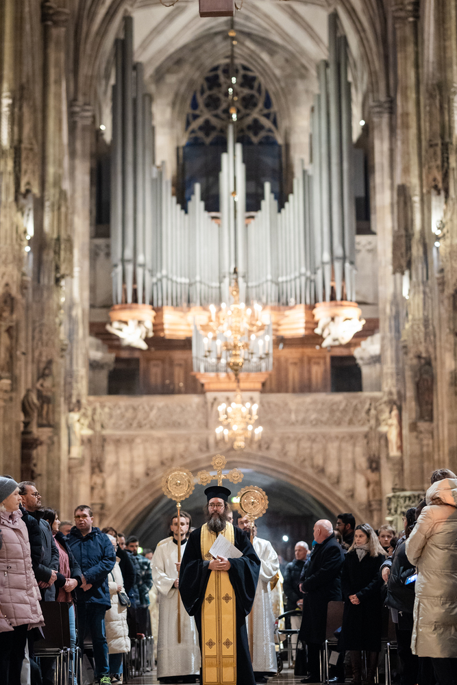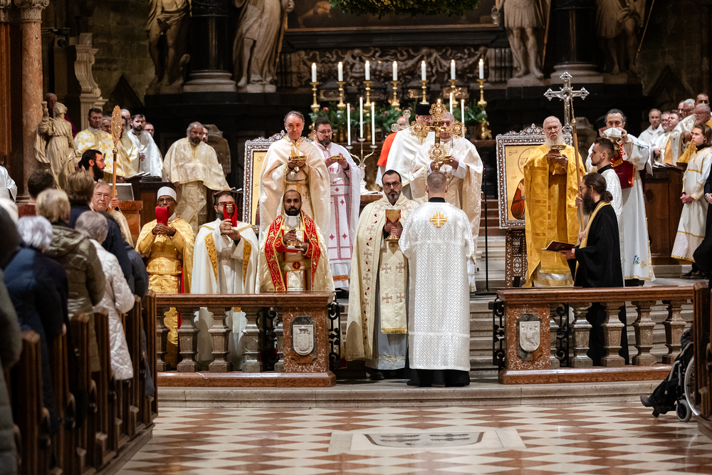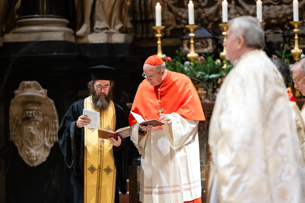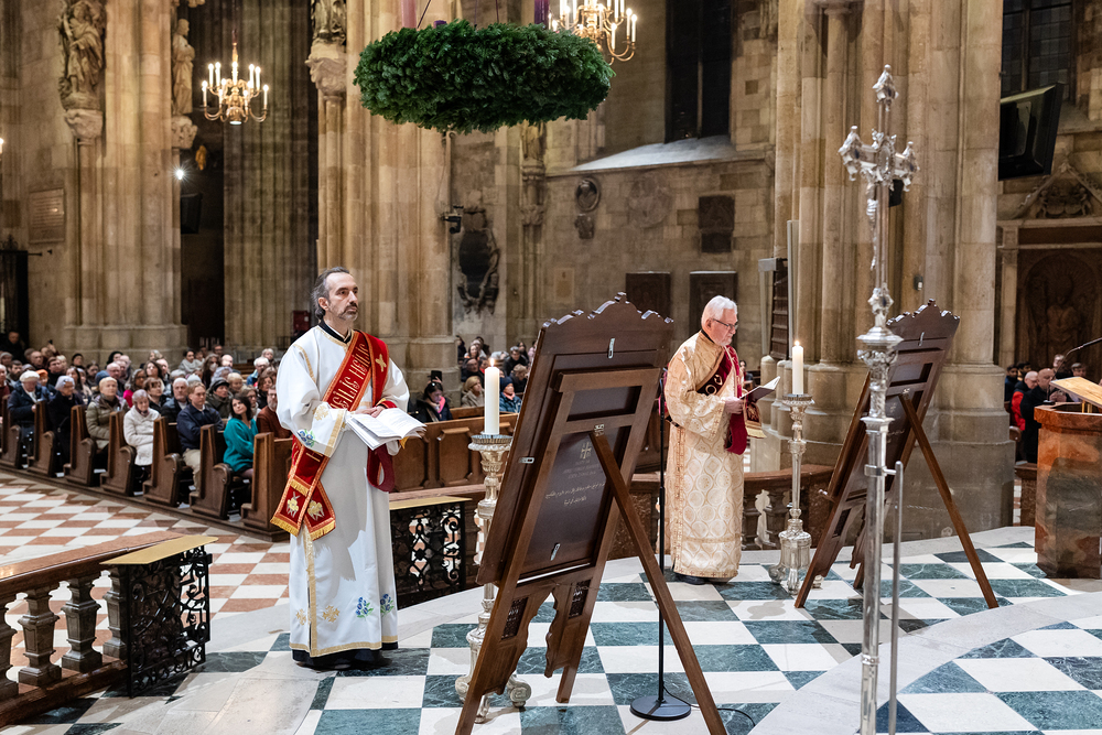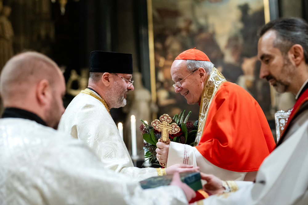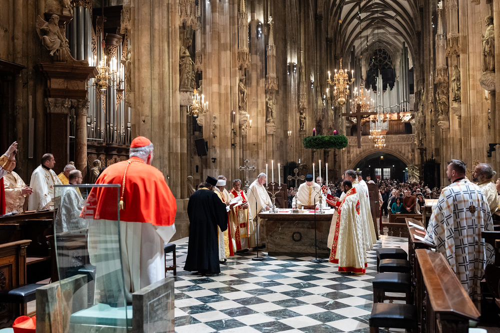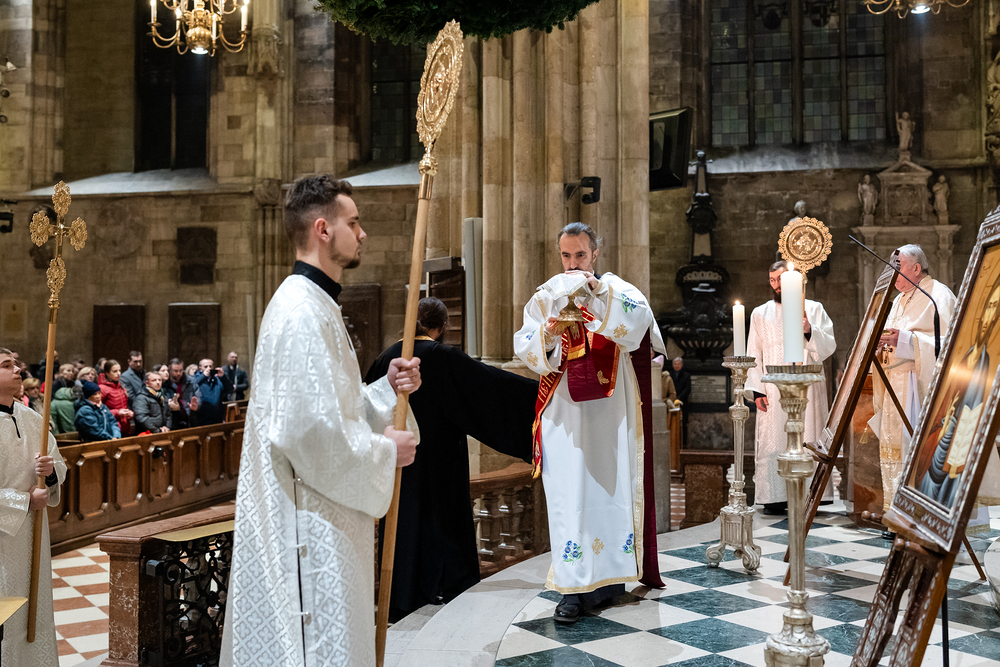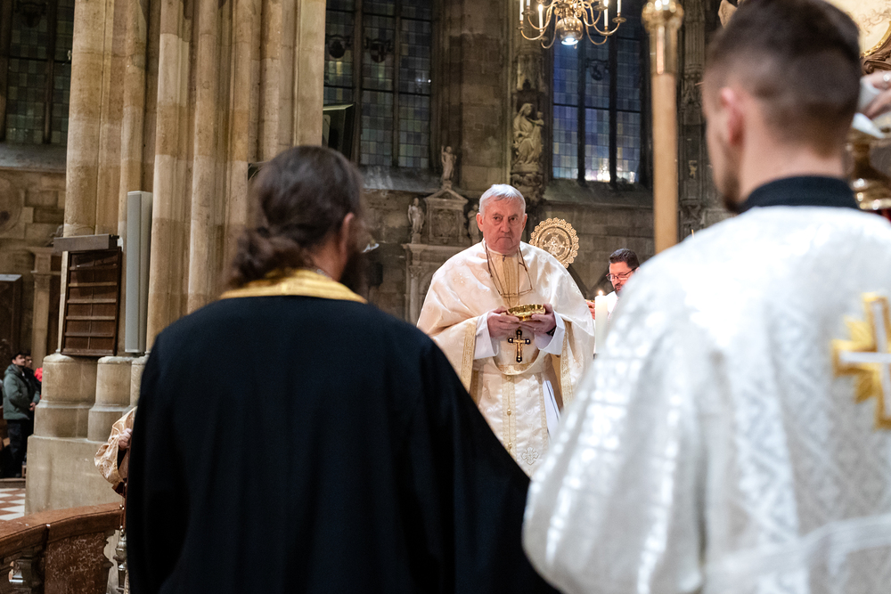 Priester und Gläubige aus allen Riten der in Österreich vertretenen katholischen Ostkirchen haben am Samstagabend im Wiener Stephansdom Kardinal Christoph Schönborn für dessen drei Jahrzehnte langen Hirtendienst gedankt. Der Wiener Erzbischof, für den angesichts seines 80. Geburtstags im Jänner demnächst ein Nachfolger ernannt werden dürfte, ist seit drei Jahrzehnten auch Ordinarius und somit Letztverantwortlicher der mit Rom verbundenen Kirchen. Deren Vertreter, angeführt vom zuständigen Generalvikar Yuriy Kolasa, würdigten Schönborns Verdienste bei einer vom Ostkirchenordinariat organisierten Feier im byzantinischen Ritus - der Göttlichen Liturgie des heiligen Johannes Chrysostomus. Wir waren mit der Kamera dabei.
