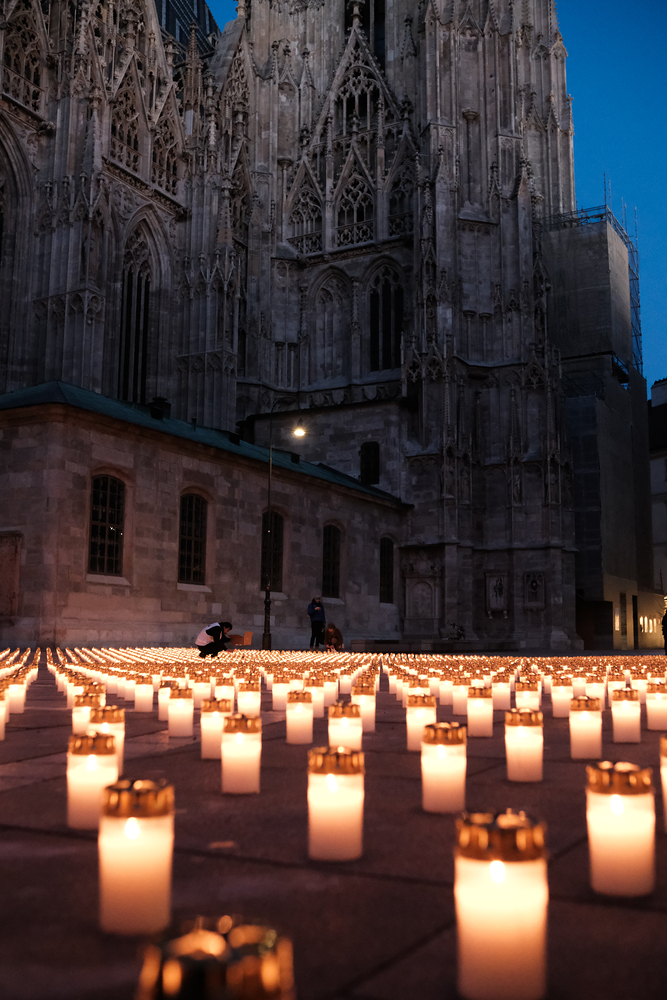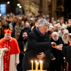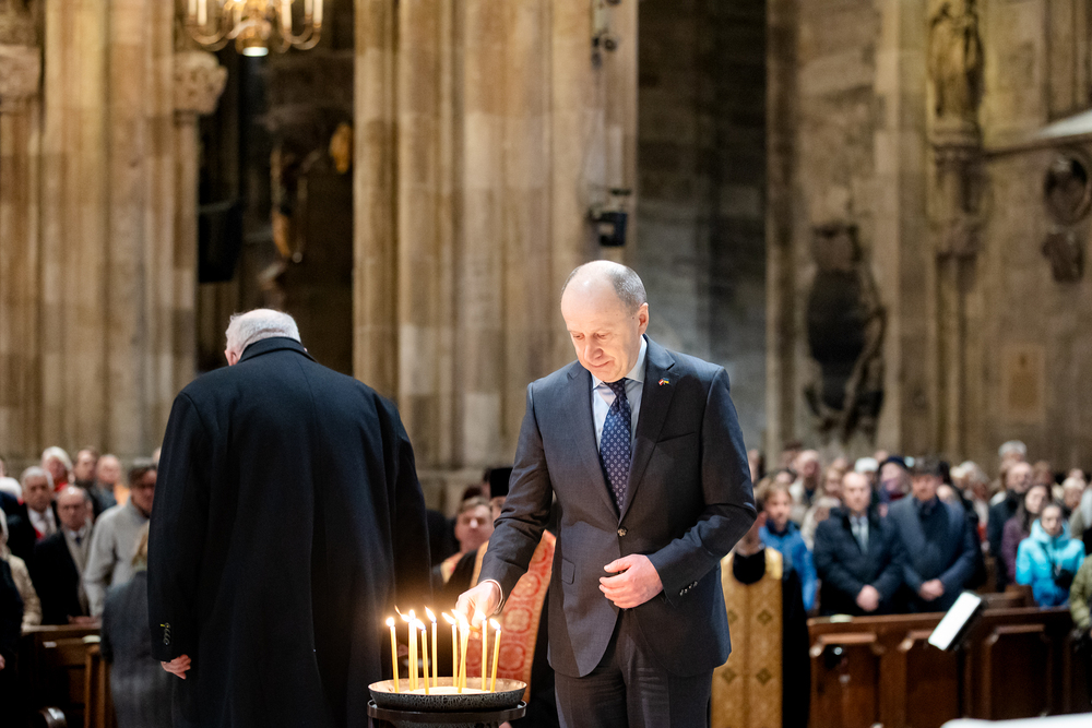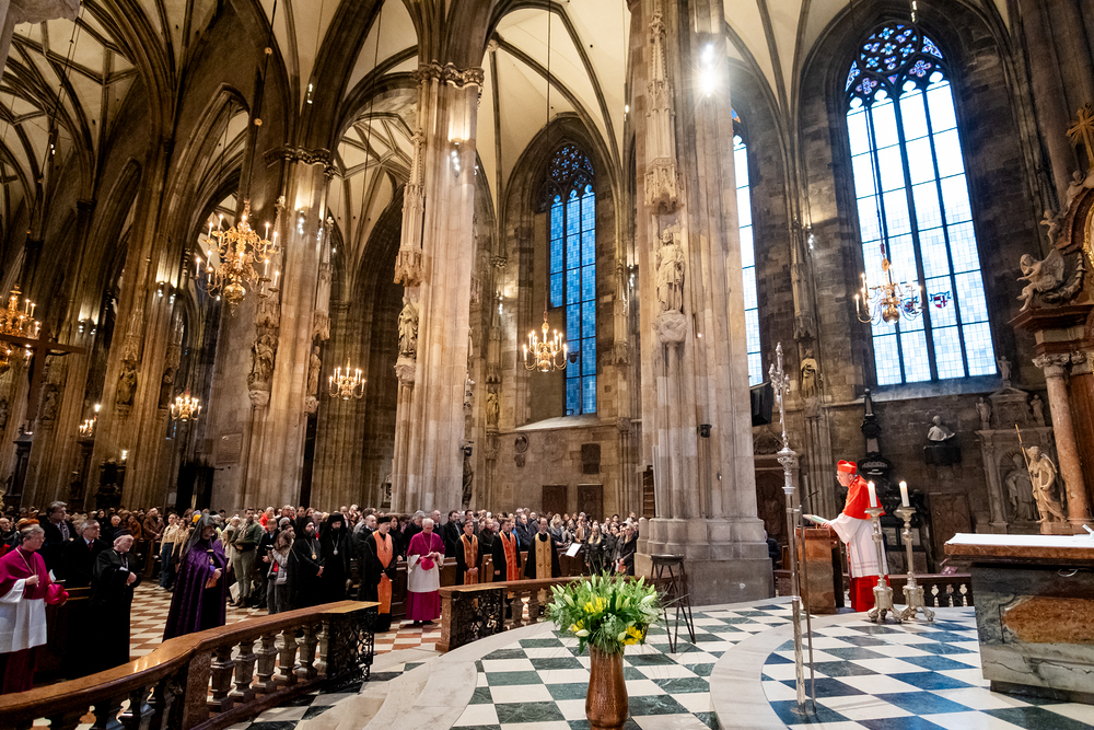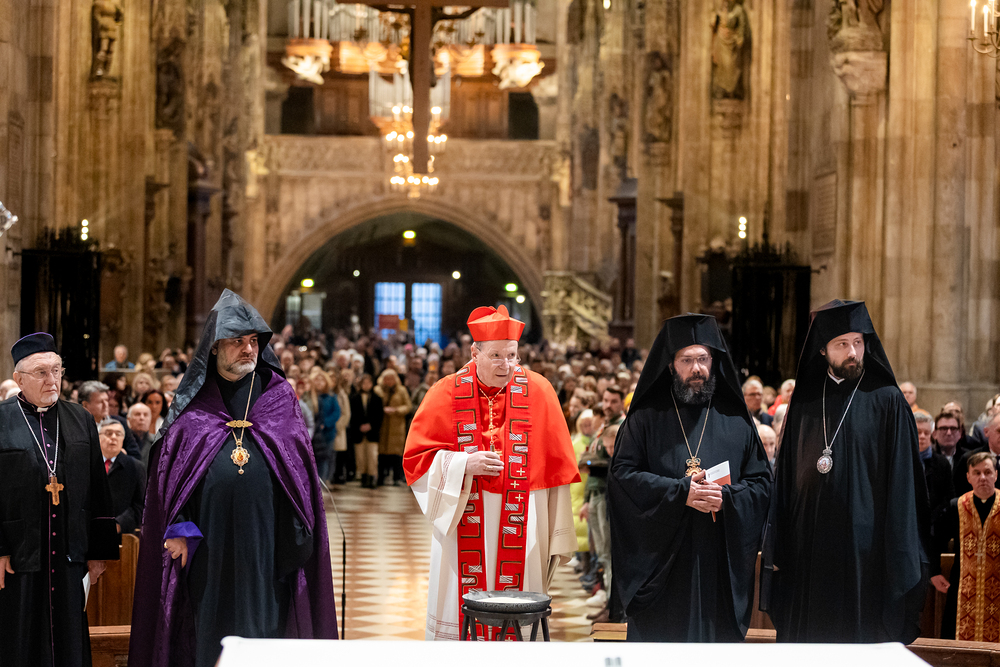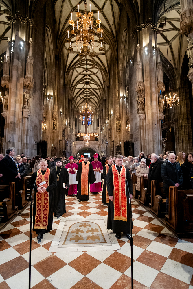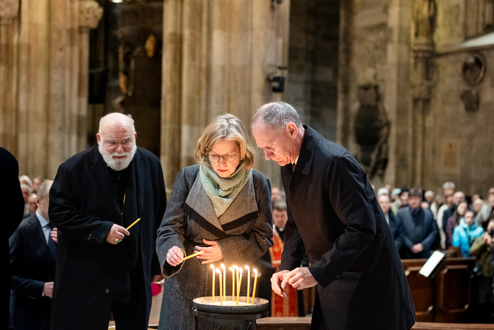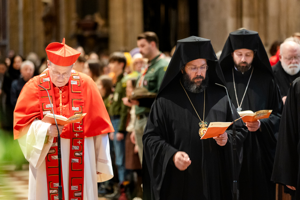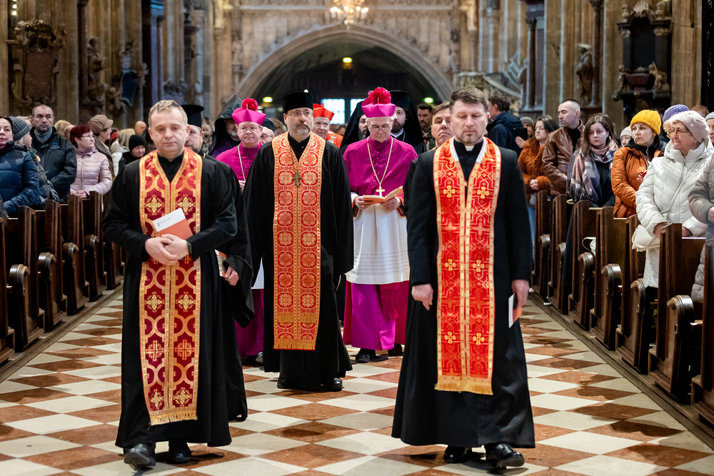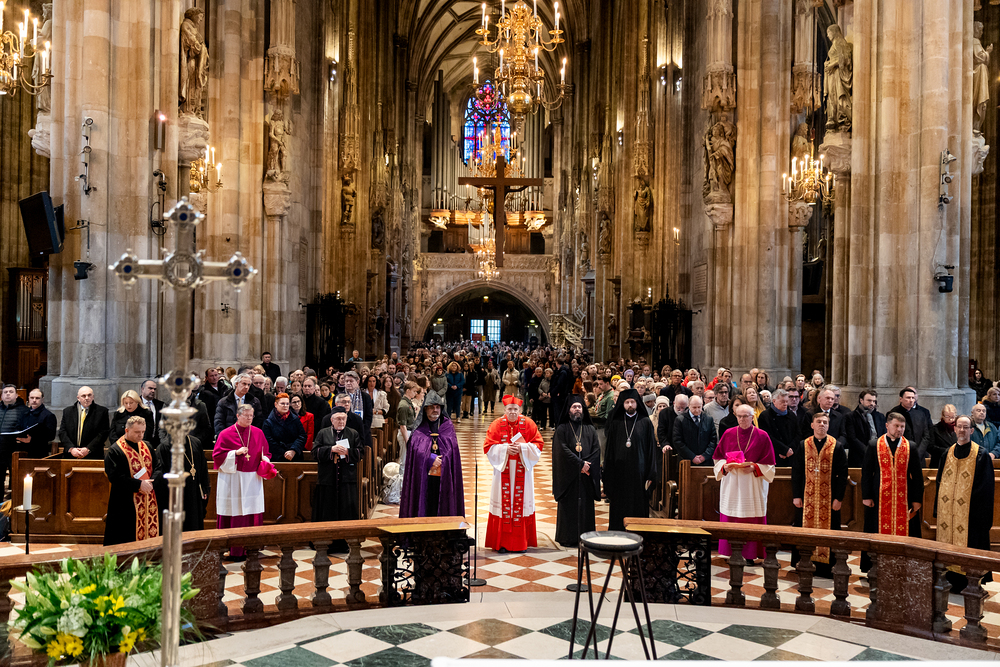 Zum dritten Jahrestag des russischen Angriffs auf die Ukraine fand im Wiener Stephansdom ein ökumenisches Friedensgebet statt, an dem Kardinal Christoph Schönborn teilnahm. Das Gebet wolle "die Stimmen der vielen Leidenden aufgreifen und ein Licht der Hoffnung inmitten der Dunkelheit entzünden. An dem Gottesdienst nahmen neben Kardinal Schönborn auch der päpstliche Gesandte in Österreich, Nuntius Erzbischof Pedro Lopez, der armenisch-apostolische Bischof und Vorsitzende des Ökumenischen Rates der Kirchen in Österreich, Tiran Petrosyan, der griechisch-orthodoxe Metropolit und Vorsitzende der Orthodoxen Bischofskonferenz in Österreich, Arsenios (Kardamakis), der für die ukrainischen Gläubigen in Österreich zuständige orthodoxe Weihbischof Maximos Rudko sowie Chorepiskopus Emanuel Aydin von der Syrisch-Orthodoxen Kirche teil; weiters etwa auch Ostkirchen-Generalvikar Yurij Kolasa, der Wiener Weihbischof Franz Scharl und Domdekan Rudolf Prokschi. Desweiteren erinnerte die Caritas bei einem Lichtermeer aus Tausenden auf dem Wiener Stephansplatz entzündeten Kerzen an das Schicksal der Menschen im Ukrainekrieg.Wir waren mit der Kamera dabei.