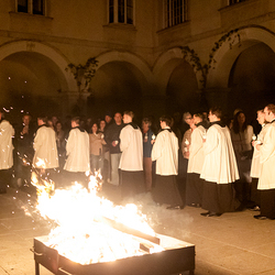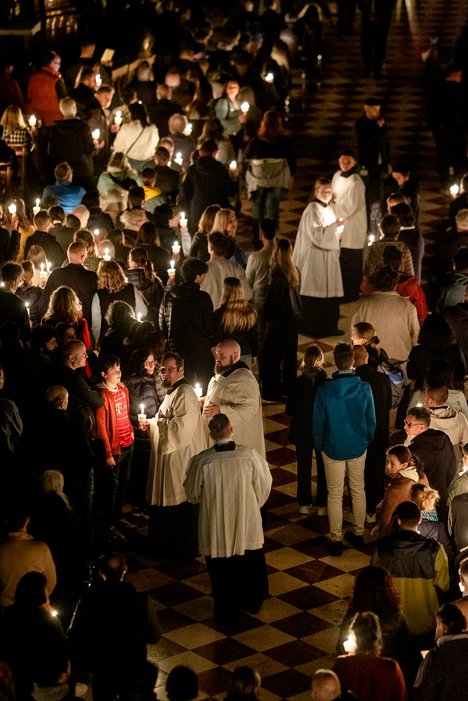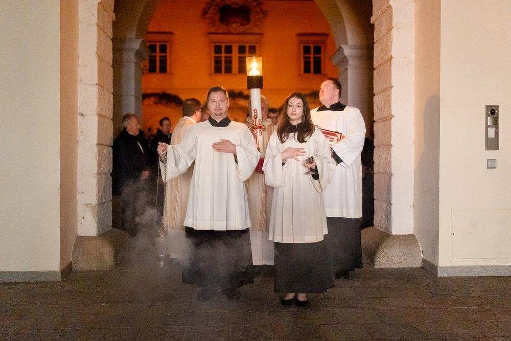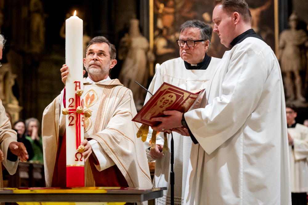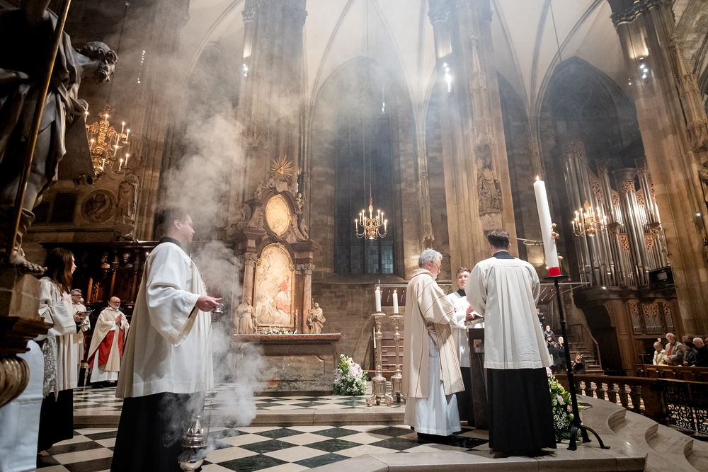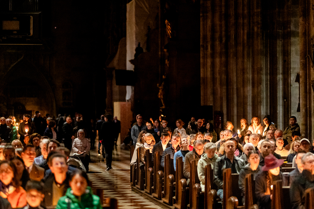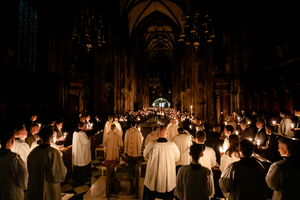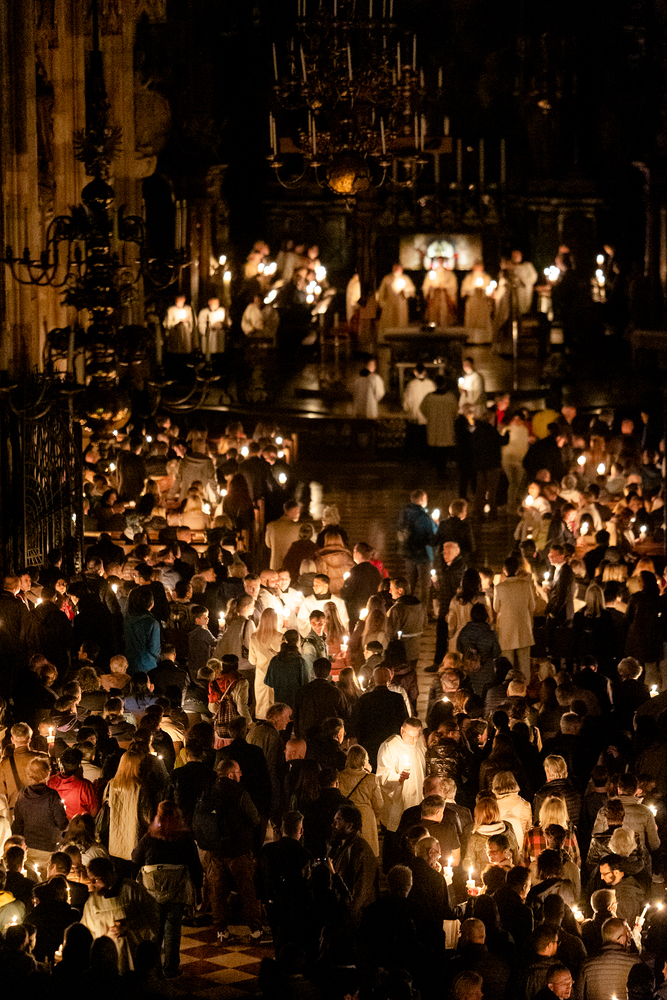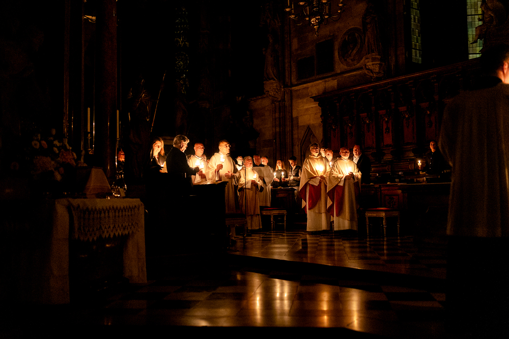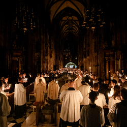 Die Osternachtsfeier im Stephansdom in Wien ist die heiligste Liturgie des Kirchenjahres, in der die Auferstehung Jesu Christi in einer feierlichen Vigil mit Wortgottesdienst, Tauffeier und Eucharistie gefeiert wird. In der Dunkelheit beginnt die Feier mit der Segnung des Osterfeuers und der Osterkerze, deren Licht sich als Zeichen des auferstandenen Christus im ganzen Dom ausbreitet.