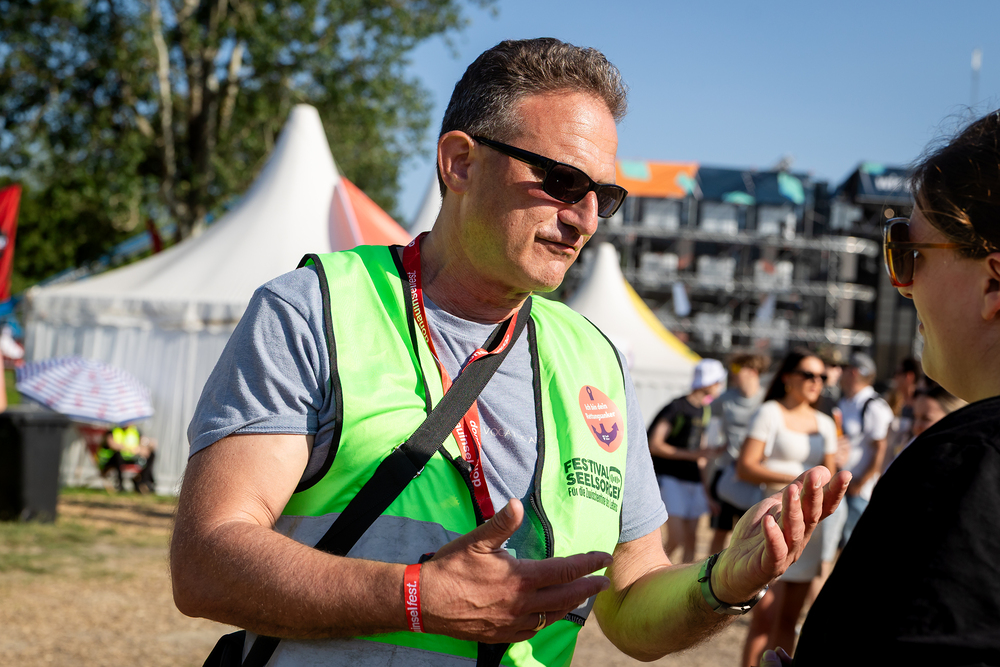 Das ökumenische Team der Festivalseelsorge, bestehend aus 40 speziell geschulten Seelsorgerinnen und Seelsorgern der Römisch-katholischen und Evangelischen Kirche, ist beim diesjährigen Donauinselfest unter dem Motto "Erzähl mir was, ich hör dir zu" im Einsatz. Die Seelsorger, erkennbar an grünen Warnwesten, bieten an einem festen Standort sowie mobil auf dem gesamten Festivalgelände kostenlose Unterstützung für alle Festivalgäste an, unabhängig von deren Religion oder Weltanschauung.Wir waren mit der Kamera dabei.