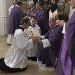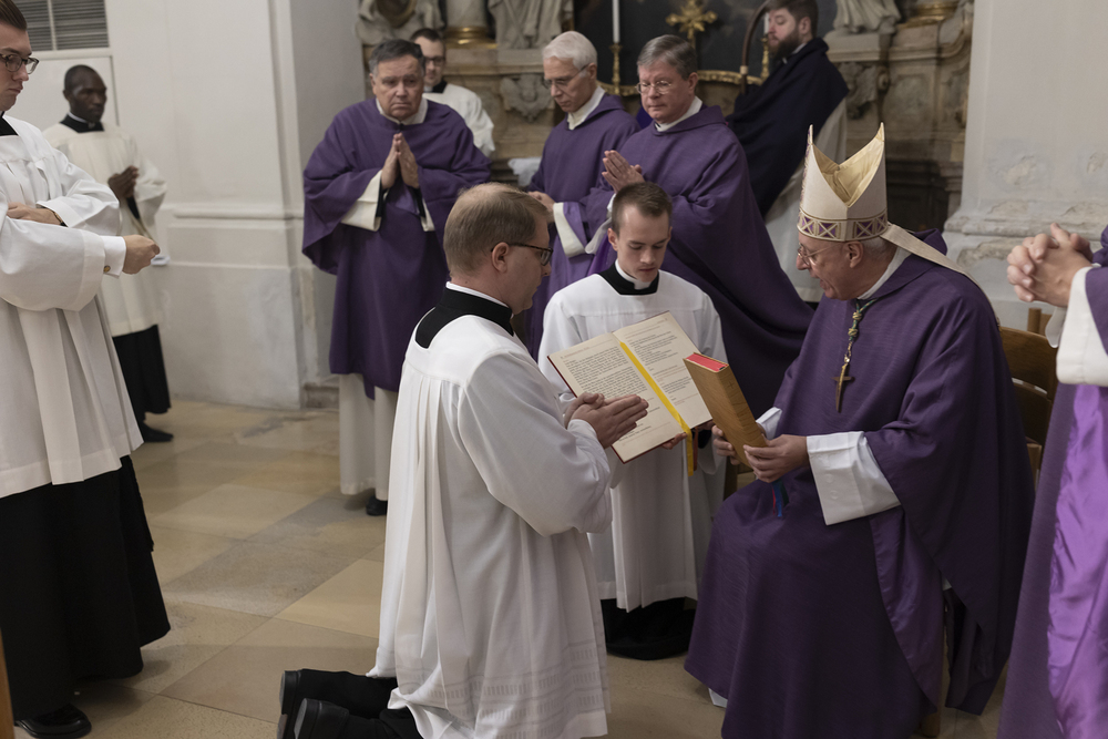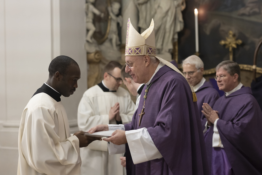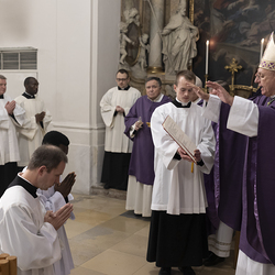 Beauftragungsfeier von Wiener Priesterseminaristen zum Akolythat und Lektorat durch Bischof Ägydius in der Seminarkirche des Priesterseminars.