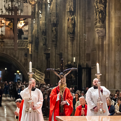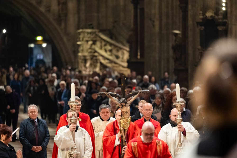 Der Karfreitag steht ganz im Zeichen der Trauer: Es geht um das Leiden, die Kreuzigung und den Tod Jesu – und was das für die Christen bedeutet. Die Liturgie an dem Tag ist in ihrer Form im Kirchenjahr einmalig. Wir haben Kardinal Schönborn im Stephansdom fotografisch begleitet.