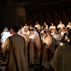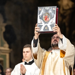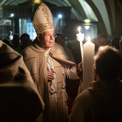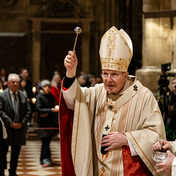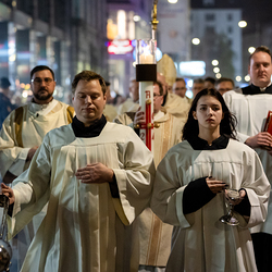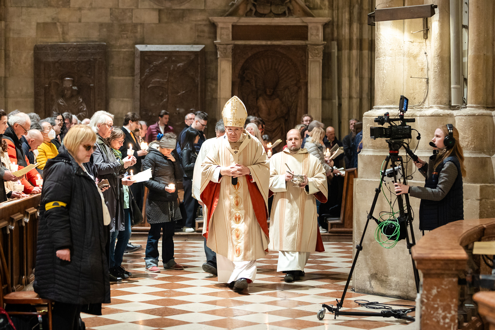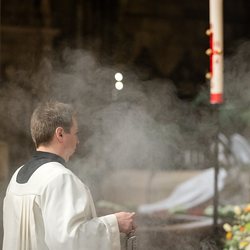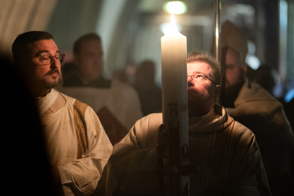 Die Osternacht ist die Feier des Lebens. Ihre Liturgie besteht aus vier Teilen – der Lichtfeier, dem Wortgottesdienst, der Tauffeier und der Eucharistiefeier. Die Lichtfeier beginnt außerhalb des Doms im Hof des Erzbischöflichen Palais. Hier wird die Osterkerze am Osterfeuer entzündet und zum Dom getragen – damit beginnt die Feier der Osternacht. Wir waren mit der Kamera dabei