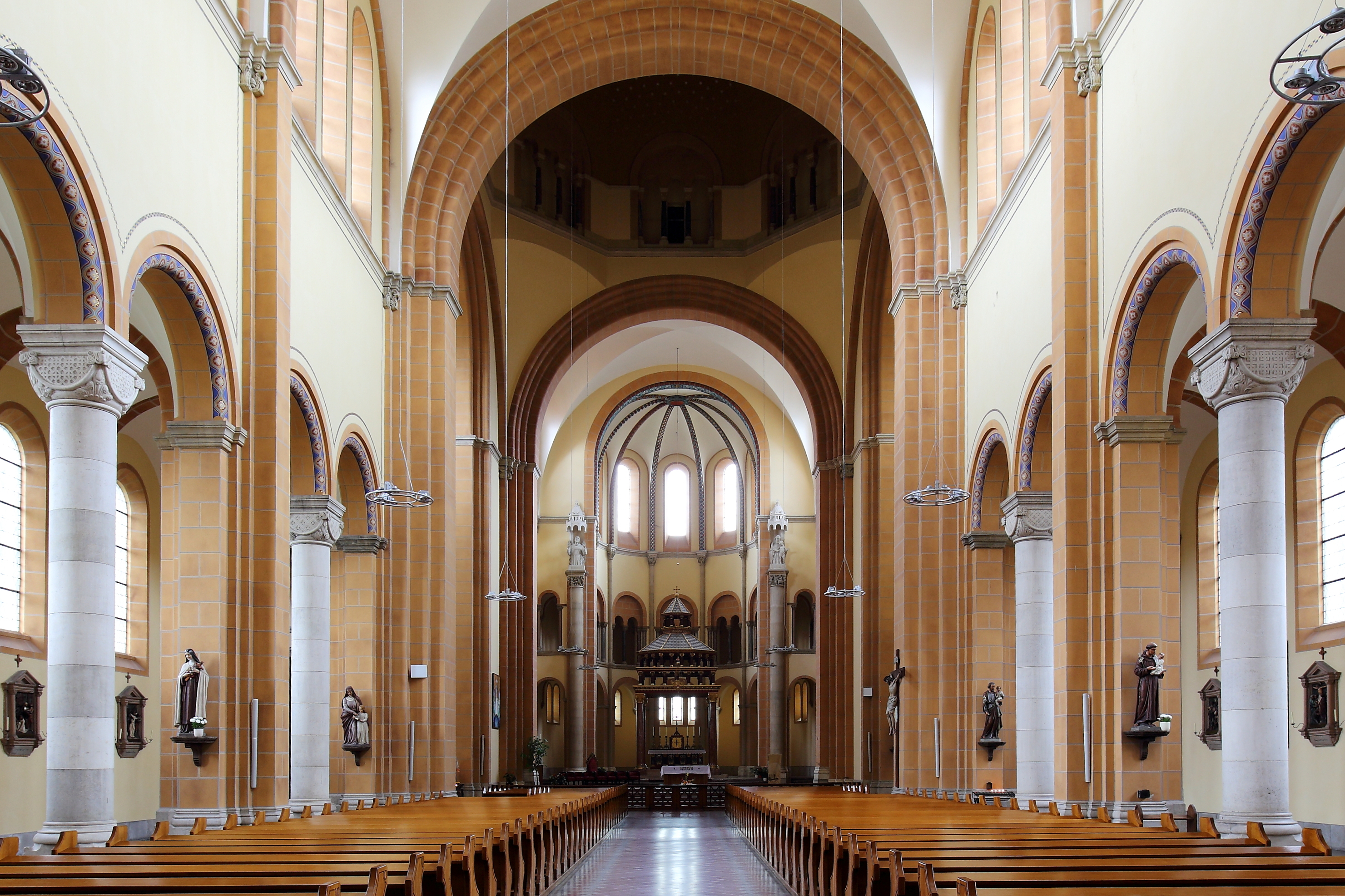 A competition was held to select the design and was won by architect Victor Luntz (1840-1903); the draft was orientated in terms of the design of the building and its position on the river, the design was based on the Groß St. Martin Church in Cologne, in a Rhenish-Romanesque style. The four-bay, basilica-like brick building was intended as a garrison church; its three red-tiled towers are visible several kilometres away. In the towers the church reaches a total height of 73m, the length is 76m.